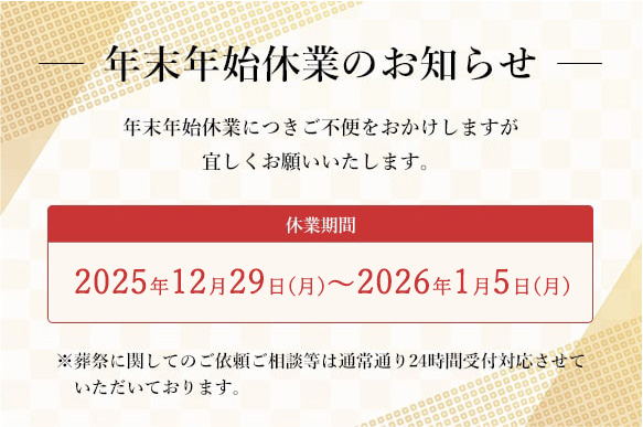お知らせ 年末年始休業に関するお知らせ 掲載日:2025.11.10 平素より会員さま及び関係各位さまには弊社をご利用いただきありがとうございます。年末年始休業についてご案内いたします。 「あんしん祭典」TVCM、女性60歳以上でCM好感度第1位を獲得 掲載日:2025.10.17 弊社の葬儀ブランド「あんしん祭典」のTVCM「登場」篇が、女性60歳以上で全3,856作品中、CM好感度第1位を獲得しました。 テレビ朝日で「あんしん祭典」が紹介されました! 掲載日:2025.8.22 この度、8月17日(土)放送のテレビ朝日「ゴーちゃんLab.」にて、弊社の葬儀ブランド「あんしん祭典」が取り上げられました。 もっと見る